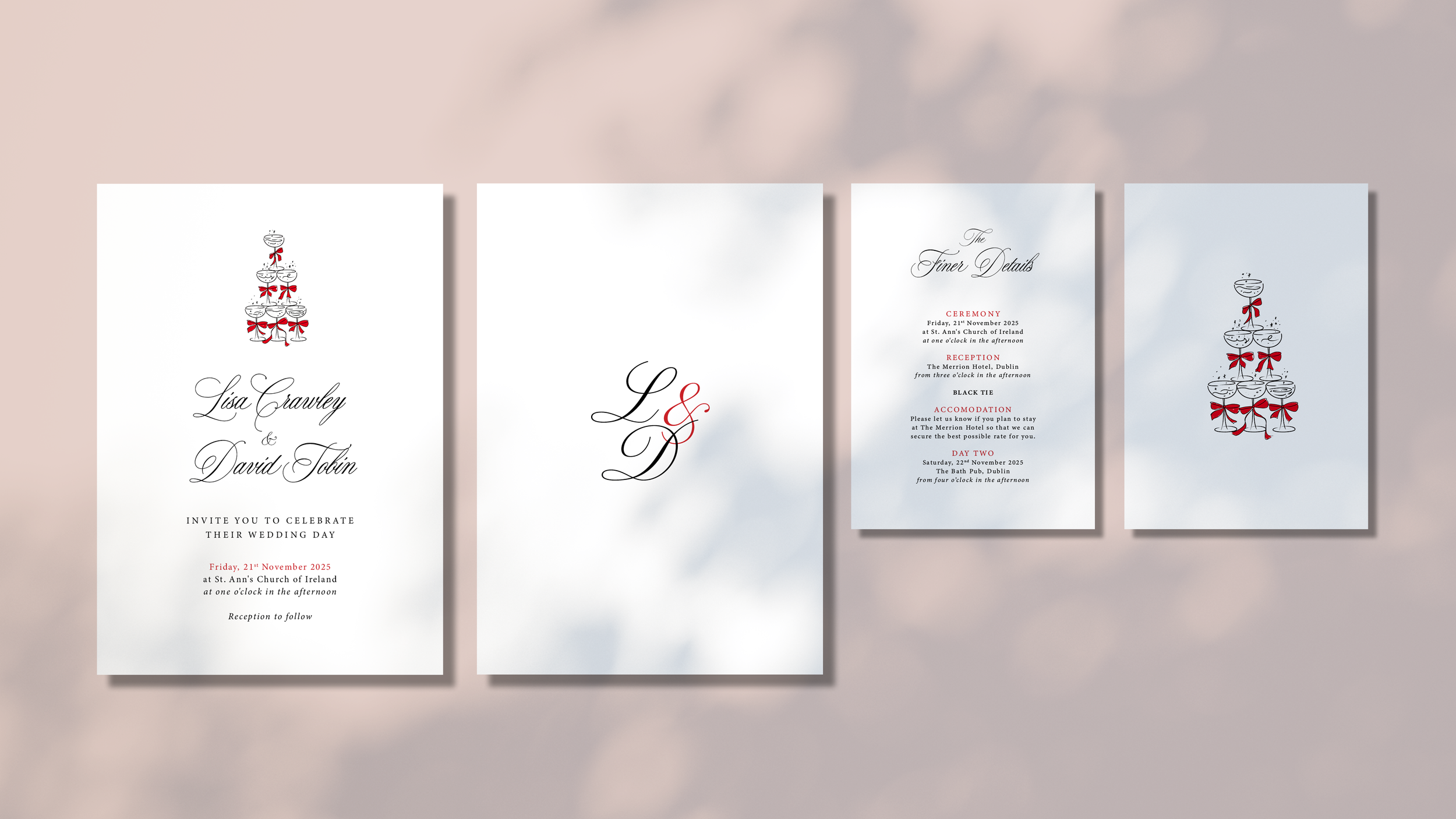 A chic blend of timeless wedding typography and playful, hand-drawn illustrations, finished with a stylish graphic of the couple’s initials on the back for that personal touch.